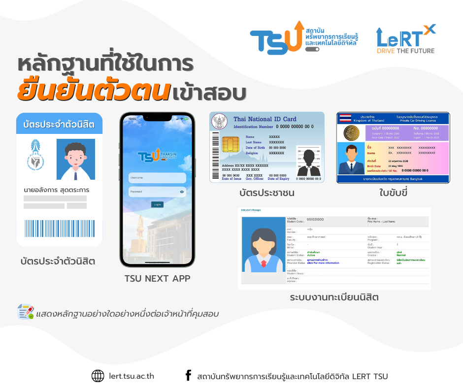 ผู้เข้าสอบจะต้องแสดงบัตรประจำตัวนิสิต/บัตรประชาชน/ใบขับขี่ อย่างใดอย่างหนึ่ง หรือ TSU Next App หรือระบบงานทะเบียนนิสิต แสดงข้อมูลต่อเจ้าหน้าที่คุมสอบ